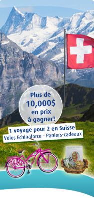 Grand Prix : Deux billets de transport aérien aller-retour en Suisse pour une expérience inoubliable; une valeur approximative de $7,500. Le prix inclus 5 nuitées et 6 jours en occupation double dans une chambre de qualité standard dans un hôtel dont une visite libre des jardins de Bioforce suisse. Le gagnant doit choisir un(e) invité(e) âgé(e) de 18 ans et plus. Le gagnant et son invité doivent voyager ensemble. Tous frais supplémentaires sont la responsabilité du gagnant et son invité. Le gagnant devra faire le voyage en septembre 2020 afin de pouvoir visiter les jardins A.Vogel.