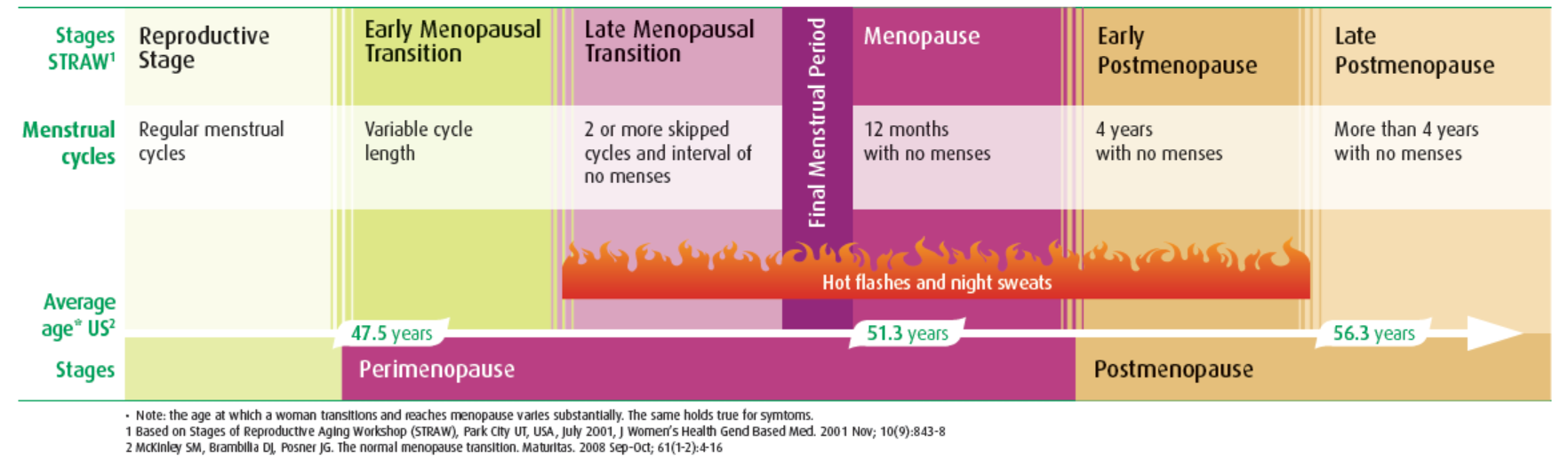 Once your periods have stopped completely for one year, you are clinically considered as menopausal. Generally, the period after 12 months with no menses, is called postmenopause. So roughly, for the average woman, if you include the perimenopause and postmenopause phases you're talking about eight to nine years in all.