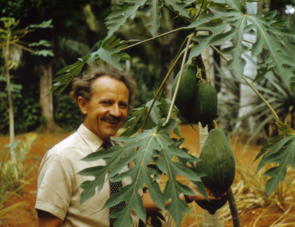 Alfred Vogel exploring different countries and plants (here a Papayatree).