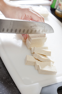 Tofu is like a sponge, absorbing the liquid in which it is stored, so pressing it before cooking is also worthwhile. In order to do this, wrap a cloth around a block of tofu and place it on a chopping board. Place a heavy plate or tray on the tofu allowing it to squeeze out the remaining water. You can press gently down in the plate but be careful not to squash the tofu.