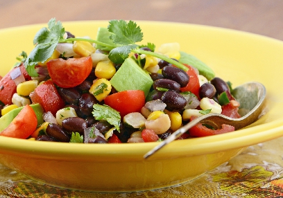 2. In a salad bowl, combine beans, corn, avocado, bell pepper, tomatoes, green onions and cilantro.