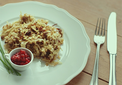2. Chop the onions and cabbage. Sauté the chopped onion in a pot, add the cabbage.