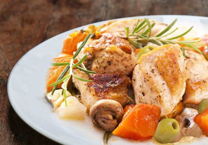 This baked chicken with green olives is a healthy recipe to make over and over again. The carrots, mushrooms and onions give it a boost of nutrition and flavor! Serve over brown rice or by itself.