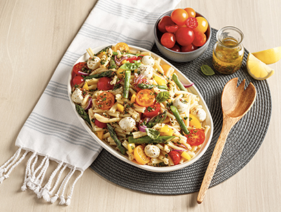 4. Add pasta, asparagus, cherry tomatoes, red onion, bell bell pepper and marinated bocconcini to the bowl. Toss to combine.