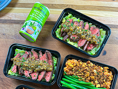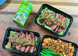 4. In a high heat pan sprayed with oil, cook steaks for 3 minutes on each side, depending on size of steaks and desired doneness. Let rest before slicing.