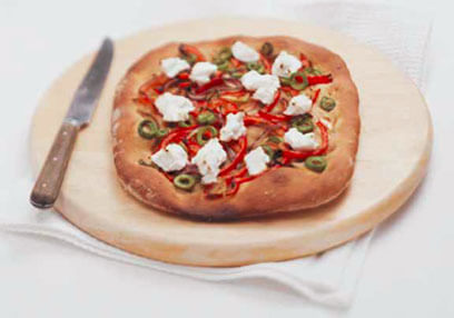 This focaccia recipe is so easy to make and you can have great fun playing with the toppings. For anyone who does not like goat's cheese, mozzarella or ricotta can be used.