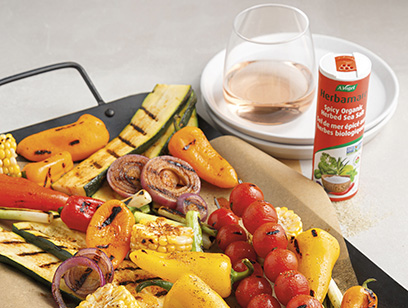 With Herbamare salt, this recipe for Grilled vegetable platter with chimichurri sauce is perfectly enhanced.