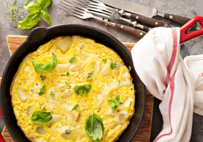 The combination of eggs, onions, potatoes and cheese is simply perfect! This frittata can be served as a brunch or evening meal, accompanied by a salad.