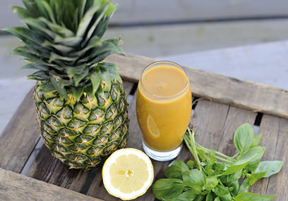 1. Peel pineapple and cut into small pieces. Peel the ginger and slice or grate into small pieces. Remove stone from avocado and cut into pieces. Mix the pineapple, ginger, carrot juice, avocado, basil and Molkosan® Fruit together and blend, using either a hand blender or blending machine.