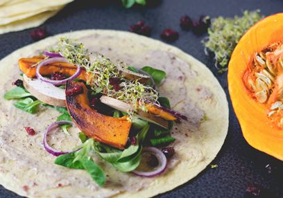 3. Spread the cranberry mousse over the tortillas, add lamb’s lettuce, pumpkin, mushrooms, onions, cranberries and Broccoli sprouts, roll up and enjoy!