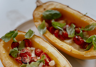 4. Place 1/4 cup of feta cheese cubes in each squash half, followed by the halved cherry tomatoes. Sprinkle the finely chopped garlic evenly over both halves.