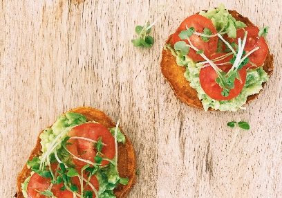 5. Spread the sweet potato slices out of a serving platter or tray. Top each slice with a dollop of smashed avocado, one tomato slice, and a sprinkling of daikon sprouts.