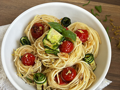 5. Add all other ingredients to the pan: cooked pasta, pasta & broth water, Herbamare original, lemon juice, olive oil, zucchinis, fresh basil and cheese of choice.