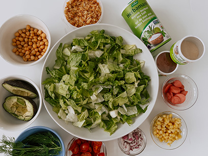 1. In a large bowl, add the lettuce and then spread out every other ingredient clockwise on top.