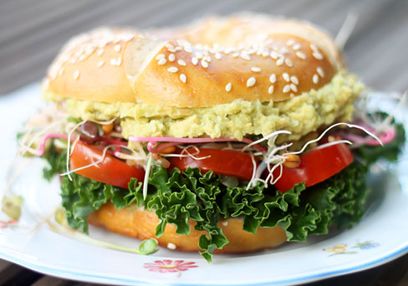 4. Finally, slice your bagel horizontally through the middle and cover the lower half as desired – with kale, tomato slices and your home-grown sprouted shoots.