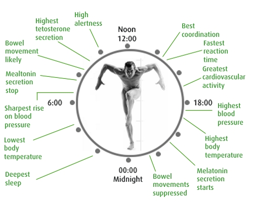 This graphic illustrates the circadian patterns typical of someone who rises early in morning, eats lunch around noon and goes to sleep at 10 pm.