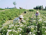 The Yarrow's basal leaf rosette and annual, 20cm to 80cm high, leaved stalk rises from a creeping, perennial rootstock. The lanceolate leaves are bi- to tri-pinnate. The leaves and stalk are finely haired. At the end of the stalk stand the small double flowerheads with white, pink or purple lingulate flowers in flat-topped clusters. Yarrow flowers from May to October. The Yarrow has numerous subspecies that are not easy to distinguish morphologically but whose chemical composition differs greatly. Bioforce cultivates the tetraploid (= having four times the normal amount of chromosomes) subspecies ssp. collina. It is the only subspecies containing the blue essential oil, azulene.