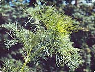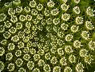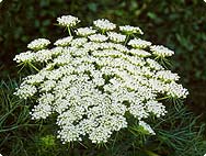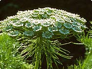 This perennial and sometimes biennial plant puts out an erect, round, furrowed stem which can grow to a height of 80-120 cm. The leaves are approximately 20 cm long, greyish green in colour, jagged and finely divided. The stalk branches out at the top and is slightly arched, terminating in large umbels which branch out into often as many as one hundred different rays, from which smaller umbels of white flowers containing many petals issue forth. The rays of umbels are thick and stiff when ripe and contract into “nests”. Once they have become woody, these pleasant-tasting rays of umbels are used as toothpicks. The tiny egg-shaped, elliptical, smooth fruits decay to form two partial fruits when the plant is dry. Each of these fruits is approx. 2 mm in length and is greyish brown in colour. This plant’s inflorescence is the same as that of the carrot, Daucus carota, which is why in German-speaking countries it also bears the common name “Knorpelmöhre” (“noded carrot”). Unlike the carrot, however, the seeds of the Ammi are completely smooth; moreover the khella is hygrochasic which means that the rays of umbels open up in damp weather and close again in dry conditions. The umbellifers native to Europe are xerochasic, i.e. they open in dry conditions and close in damp weather. The plant is in bloom in July.