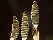 Horsetail has a perennial root-stock and rhizome which can extend to 2 metres below ground. Two kinds of annual stems are produced from this root-stock: fertile and barren. The fertile stem appears after the snow thaws. This pencil-thick fruiting stem is unbranched and grows to a height of around 15 cm; it is pale brown to reddish in colour. The stems bear a characteristic brownish-coloured, terminal cone-shaped catkins containing whorls of closely packed peltae on which the sporophylls are to be found. At the nodes or joints of the stem, sheathes are to be found which can grow to a length of up to 2 cm and bear between six to twelve blackish-brown teeth or tips. As soon as the fertile stem withers, a pale green, barren frond appears in the same place, which can grow to a height of 40 cm. Unlike the fruiting stem, whorls of four or five-winged side branches rise from the internodules of the barren stem. The barren stem is furrowed and rough on the surface, this roughness is due to deposits of silicic acid (both fluid and crystallised) inside the stem. The plant spores from March to April.