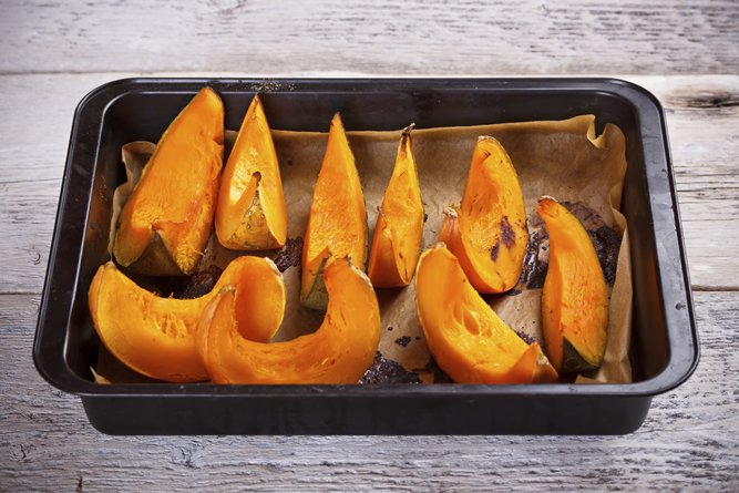 Le rôtissage est la meilleure méthode de cuisson de la citrouille, car c’est ce qui permet de mieux en faire ressortir la saveur tout en préservant ses précieux nutriments. La citrouille rôtie constitue un fabuleux plat principal, accompagnée de chou frisé et de yogourt, avec des pâtes, dans un risotto ou apprêtée selon une multitude de recettes. Elle est également impeccable en accompagnement et se marie aussi bien aux poissons, aux viandes, aux œufs qu’au soya/tofu/quorn. Pour un petit extra de bêta-carotène, essayez-la en purée avec des pommes de terre! Le secret d’une citrouille rôtie à la perfection n’a rien de compliqué :