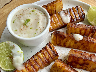 4. Servez les ananas avec la trempette au yaourt de coco et au citron vert, puis ajoutez du sel de mer Herbamare supplémentaire si désiré! Bonne dégustation !