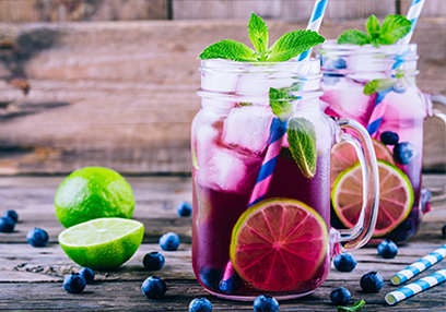2. Verser le nectar de myrtilles, le jus de lime et l'eau gazéifiée sur les glaçons (au choix).