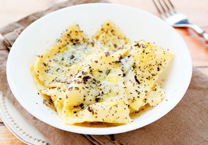 4. Préchauffer le four à 180 °C (350 °F). Déposer les raviolis sur une plaque à pâtisserie tapissée d’un papier parchemin. Faire fondre le beurre et en badigeonner les raviolis et les branches de romarin. Cuire sur la grille inférieure du four environ 15 minutes.