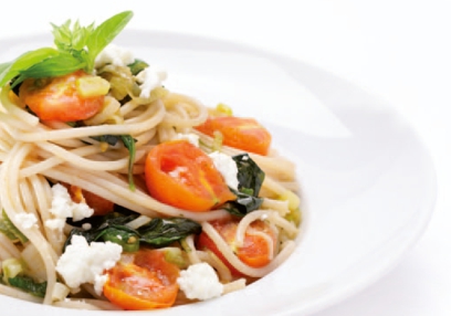 5. Ajouter les spaghettis égouttés avec les feuilles de basilic au mélange de tomates.
