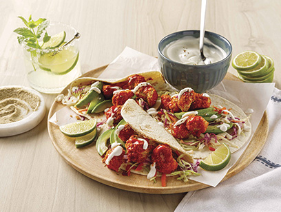 7. Garnir les tortillas de salade de chou, de chou-fleur Buffalo, d’avocat et de crème sure.