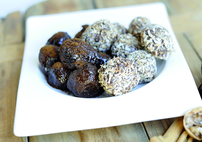 8. Enrober la moitié des boules dans de la poudre Bambu® et l’autre moitié dans de la noix de coco râpée.